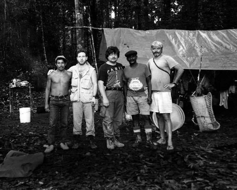 Наш лагерь на Вака-Вака-пу: индеец-проводник Ллойд, автор, Джо Коэн, Бад Рамчаран, Раф Свенски. В джунглях, как в тайге, все время какие-то звуки: что-то трещит, урчит, ломается. Правда, в тайге по утрам не кричали обезьяны.