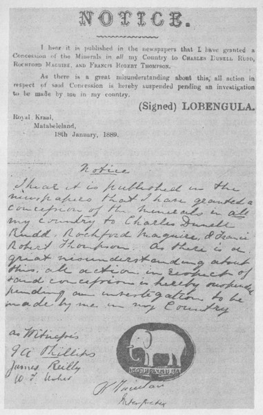 Так или иначе, Моффет свое задание выполнил: 11 февраля 1888 года Лобенгула приложил свою руку к «договору» с Англией и поставил на месте подписи крестик. Моффет скрепил бумагу словами: «Я удостоверяю истинность настоящего документа». Нашлись два «свидетеля». Они тоже поставили свои подписи…
