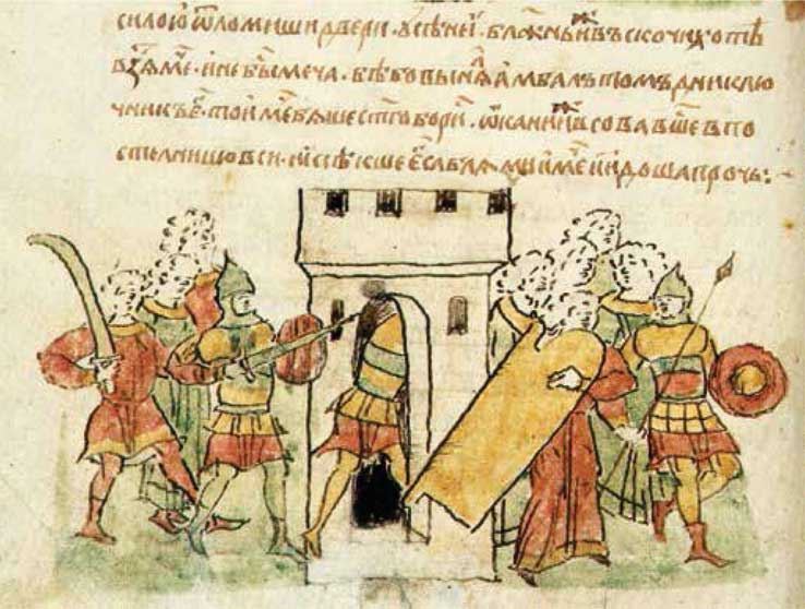 Убийцы врываются в опочивальню князя Андрея Боголюбского. Миниатюра Радзивиловской летописи