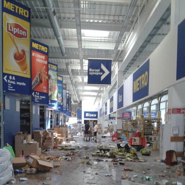28 мая вооруженными бойцами ДНР началось разграбление Торгового центра «Метро», продолжавшееся 3 дня. Бойцы батальона «Восток» утверждают, что нападение на магазин совершили сторонники самопровозглашенной ДНР, штаб которой находится в облгосадминистрации. Журналисты, попавшие в магазин, сфотографировали пьяных мародеров, которые находились возле прилавков со спиртным. Всего мародеры, как заявил директор «Метро Кеш энд Керри Украина» Клаус Ретиг, нанесли гипермаркету ущерба минимум на 1 млн евро. «Мы можем подсчитать только убытки от потери товара, который находился в магазине. Эти потери составляют порядка 1 млн. евро. Но самые большие убытки могут быть от повреждения инфраструктуры, которые в настоящее время нельзя подсчитать, так как повреждения систем кондиционирования, электропроводки, водопровода обычно незаметны», — сказал Ретиг.