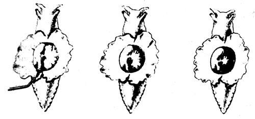 Рис. 9.2а. Рефлекс втягивания жабры и сифона у аплизии. Показано интактное животное. На сифон через трубку направлена струя воды (слева), это приводит к втягиванию сифона и фабры (в середине и справа).