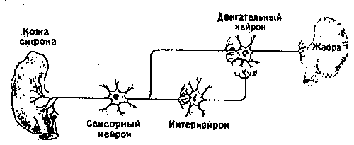 Рассмотрим сначала сам рефлекс. Аплизия дышит с помощью жабры, которая размещается в полости на верхней (дорсальной) стороне тела. В задней части этой полости имеется вырост в виде трубки — сифон. Если прикоснуться к области вокруг жабры или сифона, они втягиваются в полость: это простой защитный рефлекс. Нервный механизм такого рефлекса включает небольшое число (около 50) сенсорных нейронов, реагирующих на тактильное раздражение упомянутой области. Эти сенсорные нейроны контактируют примерно с 20 моторными нейронами как непосредственно, так и через промежуточные нейроны (интернейроны). Моторные нейроны расположены в абдоминальном (брюшном) ганглии и в свою очередь образуют синапсы на мышечных волокнах, втягивающих сифон и жабру. Эта относительно простая цепь схематически показана на рис. 9.2. Однократное раздражение поверхности тела около жабры или сифона приводит к их втягиванию, а при многократной стимуляции наступает привыкание; реакция на повторные стимулы постепенно ослабевает вплоть до ее полного исчезновения на некоторое время. Привыкание можно снять (дегабитуация, или сенситизация) сильным раздражением другого участка тела, например «хвоста», что приводит к полному восстановлению первоначальной реакции. Такие изменения рефлекса носят кратковременный и довольно неспецифический характер, и их следует рассматривать как формы неассоциативного научения. Наряду с этим, как показал Кэндел, возможна и выработка классического условного рефлекса, когда безусловным стимулом служит резкое воздействие на хвостовую область, а условным — слабое тактильное раздражение сифона. Слабая стимуляция обычно приводит и к слабо выраженному втягиванию сифона, тогда как после закрепления условного рефлекса такое же слабое раздражение вызывает сильную реакцию. Этот эффект сохраняется довольно долго, и поскольку здесь существует специфическая связь между стимулом и реакцией, его можно считать формой истинного ассоциативного научения.