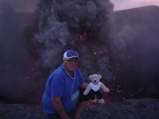 Мы оставили «Тойоту» на подходе к кратеру и пошли наверх. Вдруг, прямо казалось бы рядом, из земли, без всякого предупреждения и с оглушительным грохотом вылетел огромный столб дыма, огня и пепла. Высоко в небе эта масса начала разъезжаться во все стороны и полностью закрыла солнце. А дальше, и в течение последующих нескольких часов, мы видели нечто такое, что наверное запомнится до конца жизни. Кратер большой и глубокий – метров пятьсот в диаметре. Но активных зон было две. Такие огненные дыры диаметром ну может быть не больше десяти метров. Из левой, с интервалом в три-пять минут, вылетали гигантские столбы дыма и пепла. Из правой, с примерно такими же интервалами (но несинхронно), мощными взрывными впышками выбрасывало языки огня, искр и горящей магмы.