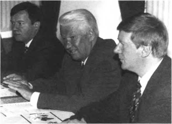 Глава администрации президента Валентин Юмашев, Борис Ельцин и первый вице-премьер правительства Анатолий Чубайс. 1997 г.
