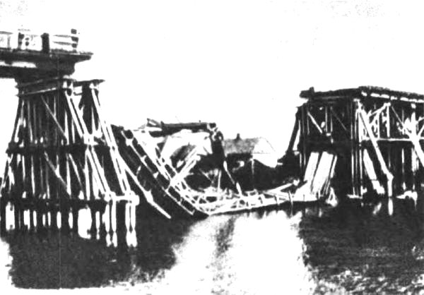 На снимке: Суворовский мост в Бресте, взорванный диверсионной группой Н. Я. Щербакова.