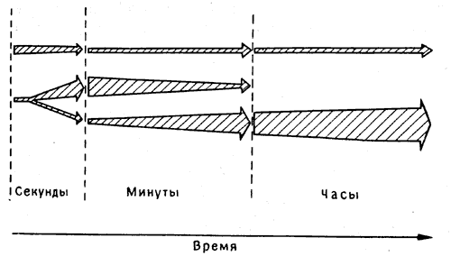 Можно представить себе разные способы такого перехода (рис. 9.1). Одним из крайних вариантов может быть непрерывный процесс, в котором некая цепь биохимических реакций в определенной группе клеток неизбежно приводит от ранней, неустойчивой фазы к фиксированному конечному состоянию, как при затвердевании клея или проявлении фотоснимка. Другой вариант допускает возможность двух (или нескольких) более или менее независимых параллельных процессов, сопровождающихся изменениями электрических свойств и чувствительности какой-то группы нейронов, которые могут в первые минуты «кодировать» память, а затем постепенно отключаться. Между тем, если воспоминание достаточно важно, чтобы стоило сохранять его долгое время, могут потребоваться такие биохимические процессы, как реконструкция синапсов, которые будут постоянно представлять память в другой группе нейронов, возможно даже в другой части мозга. Эти два типа процессов — последовательная и параллельная обработка воспоминаний — служат, разумеется, крайними примерами; есть множество промежуточных вариантов [2], и становится все труднее планировать эксперименты, в которых можно было бы четко провести различие между ними.