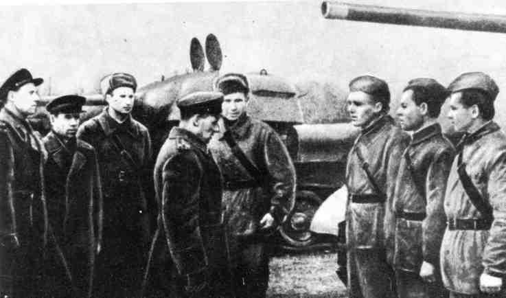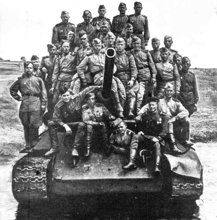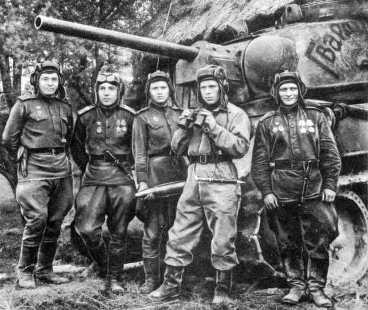 Экипаж танка «Гвардия», отличившийся во время Львовской операции. Слева направо: командир танка гвардии лейтенант А. Додонов, стрелок-радист гвардии старшина А. Марченко, заряжающий гвардии рядовой Н. Мельниченко, командир танкового батальона гвардии майор П. Чирков, механик-водитель гвардии старший сержант Ф. Сурков.