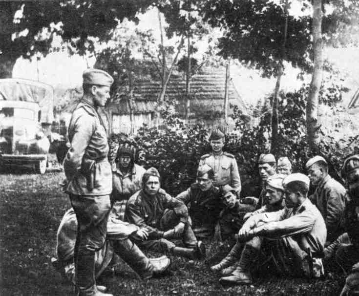 Даже в самых сложных фронтовых условиях не затихала в части политическая работа. Заместитель начальника политотдела бригады майор Дудовцев проводит инструктаж партийно-комсомольского актива.
