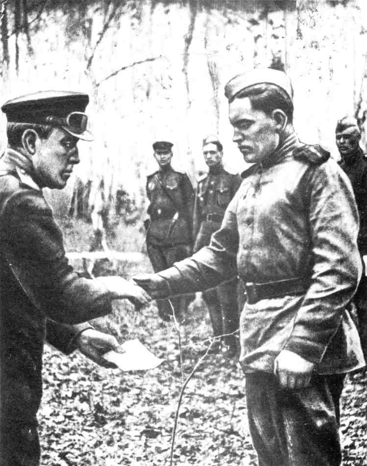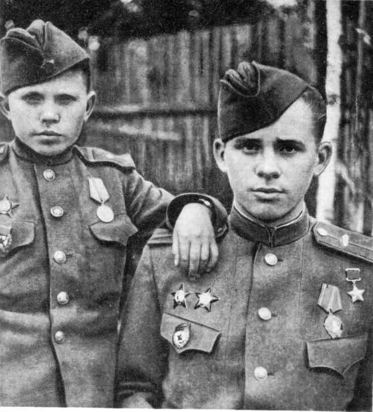 Герой Советского Союза гвардии старший лейтенант П. П. Кулешов и его друг воспитанник бригады Толя Якишев.