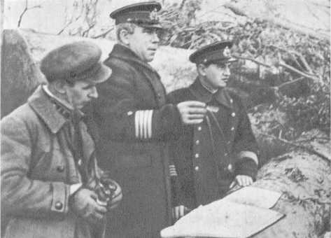 На НП командира 79-й морской стрелковой бригады. Слева направо: Н. В. Богданов, А. С. Потапов, И. А. Слесарев