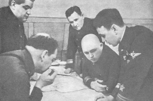На заседании Военного совета флота. Слева направо: Н. М. Кулаков, И. Е. Петров, П. А. Моргунов, Ф. С. Октябрьский, Н. А. Остряков
