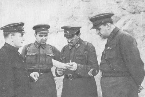 Поступило важное донесение… Слева направо: П. А. Моргунов, И. Ф. Чухнов, И. Е. Петров, М. Г. Кузнецов