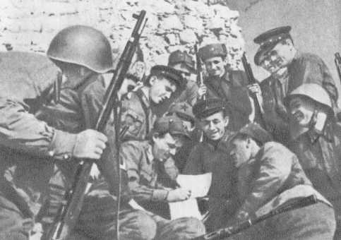 С левого фланга на правый: бойцы пограничного полка майора Г. А. Рубцова пишут письмо защитникам Рыбачьего