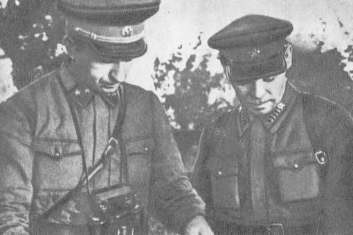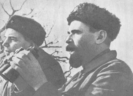 На НП командира 8-й бригады. П. Ф. Горпищенко (справа) и П. И. Силантьев