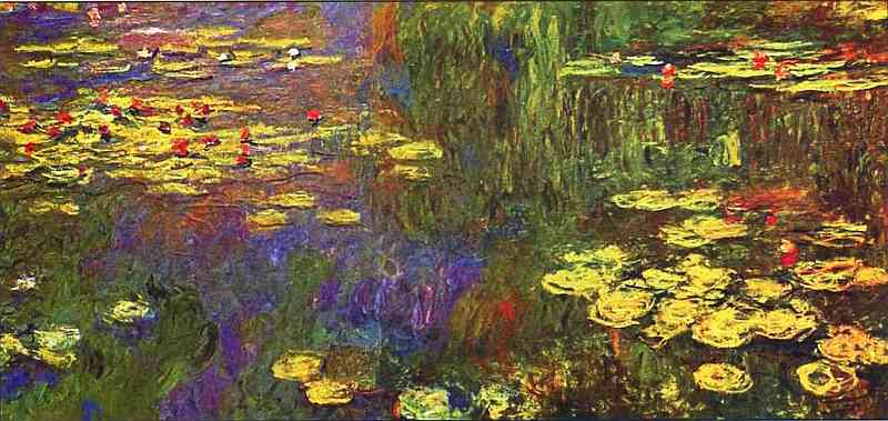 В 1916 он задумал новую серию панно размером 4?2 метра с видами своего сада. Панно «Ненюфары» («Кувшинки», 1920–1926, Музей Оранжереи, Париж) рождает ощущение плоскостности и бесконечности пространства, словно утекающего за рамы картины. Крупными сочными мазками художник намечает форму листьев и цветов, работает цветовыми пятнами.