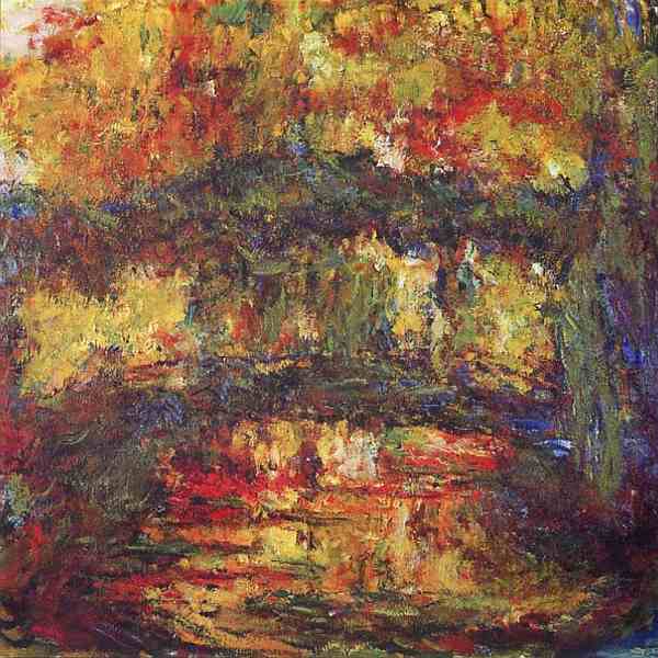 В «Японском мостике» (1918–1924, Институт искусств, Миннеаполис) читаются очертания любимого мостика, перекинутого через пруд с кувшинками и увитого глициниями. И это, пожалуй, единственное, что можно «идентифицировать» в сумасбродстве красок, не считая невысокого куста на переднем плане картины и вер тикали дерева у правого края. Здесь достаточно охватить композицию в целом, не дробя на части, чтобы увидеть ее глазами художника: буйство красок, полнота жизни, красота. Видеть красоту и творить ее, жить для искусства и писать до последнего дня.