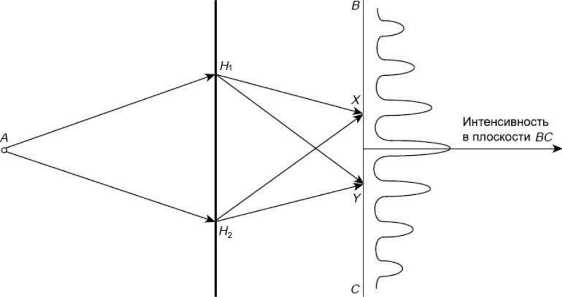 Схема двухщелевого эксперимента: А — источник микрочастиц; Н1 и Н2 — отверстия (щели); ВС — экран; X, Y — точки наложения волн.