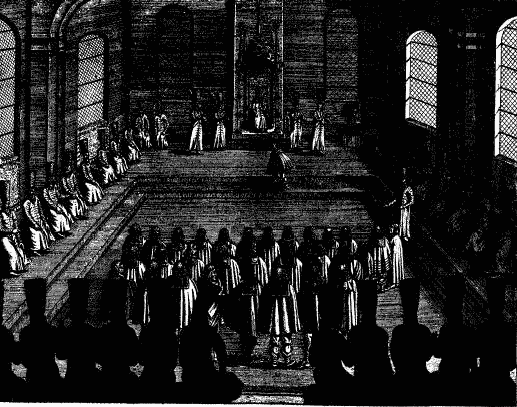 Аудіенцъ-залъ представлялъ собою четырехугольное каменное сводчатое пом?щеніе, покрытое снизу и по сторонамъ красивыми коврами и сверху украшенное рисунками изъ Библейской исторіи, изображенными золотомъ и разными красками. Тронъ великаго князя сзади у ст?ны поднимался отъ земли на три ступени, былъ окруженъ тремя серебряными позолоченными колонками толщиной въ три дюйма; на нихъ покоился балдахинъ въ вид? башенки, поднимавшейся на три локтя въ вышину. Съ каждой стороны балдахина стояло по серебряному орлу съ распростертыми крыльями. На вышеозначенномъ престол? сид?лъ Его Царское Величество въ кафтан?, осыпанномъ всевозможн?йшими драгоц?нными камнями и вышитомъ крупнымъ жемчугомъ. Корона, которая была на немъ поверхъ черной собольей шапки, была покрыта крупными алмазами, также какъ и золотой скипетръ, который онъ, в?роятно въ виду его тяжести, по временамъ перекидывалъ изъ руки въ руку. Передъ трономъ Его Царскаго Величества стояло четыре молодыхъ и кр?пкихъ князя, по двое съ каждой стороны, въ б?лыхъ дамастовыхъ кафтанахъ, въ шапкахъ изъ рысьяго м?ха и б?лыхъ сапогахъ; на груди у нихъ крестообразно вис?ли золотыя ц?пи. Каждый держалъ на плеч? серебряный топорикъ, какъ бы приготовившись ударить имъ. У ст?нъ, кругомъ, сл?ва и напротивъ царя, сид?ли знатн?йшіе бояре, князья и государственные сов?тники, челов?къ съ 50, вс? въ очень роскошныхъ одеждахъ и высокихъ черныхъ лисьихъ шапкахъ, которыя они, по своему обычаю, постоянно держали на головахъ. Въ пяти шагахъ отъ трона вправо стоялъ государственный канцлеръ. Рядомъ съ престоломъ великаго князя направо стояла золотая держава, величиной съ шаръ для игры въ кегли, на серебряной, р?зной пирамид?, которая была высотою въ два локтя. Рядомъ съ державою стояла золотая чашка для умыванія и рукомойникъ съ полотенцемъ, чтобы Его Царское Величество, какъ только приложатся къ его рук?, могъ умыться[6].