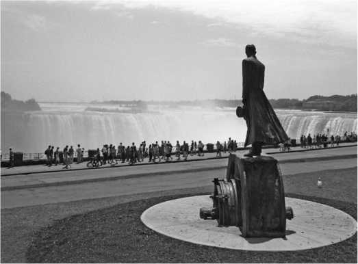 Памятник Николе Тесле у Ниагарского водопада с постаментом в виде динамо-машины переменного тока.