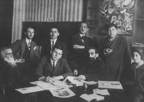 Сидят: Василий Барнов, Георгий Леонидзе, Якоб Николадзе, Тамара Абакелия. Стоят: Кирилл Зданевич, Валериан Гаприндашвили, Паоло Яшвили, Тициан Табидзе. Тбилиси. Редакция журнала «Бахтриони». 1922 год
