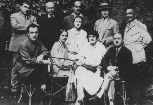 Первый ряд: Колау Надирадзе, Клавдия Васильева (Бугаева), Тамара Яшвили, Нина Табидзе, Николо Мицишвили. Второй ряд: Тициан Табидзе, Андрей Белый (Борис Бугаев), Паоло Яшвили, Григол Робакидзе, Сандро Шаншиашвили. Тбилиси. 1929 год