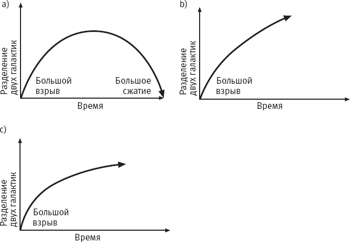 На рисунках 6.1b и 6.1c представлены две другие модели, которые также соответствуют предпосылкам Фридмана (вселенная выглядит одинаково во всех направлениях и из любой точки). На рис. 6.1b расширение происходит значительно быстрее. Гравитация не может его остановить, только слегка замедляет. На рис. 6.1с вселенная расширяется не так быстро, как на рис. 6.1b, но достаточно быстро, чтобы избежать коллапса. Скорость расхождения галактик становится все меньше и меньше, однако они продолжают расходиться. Если верна какая-либо из этих двух моделей вселенной, то пространство бесконечно: оно не заворачивается само на себя.