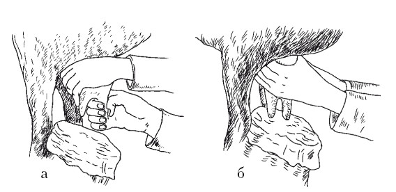 • Раздаивание (пальцами правой руки – левая удерживает вымя) – из канала соска удаляют молоко и возможный молочный сгусток (тромб). Большой палец правой руки сгибают в суставе и им нажимают на сосок. Ведут кисть руки сверху вниз по соску.