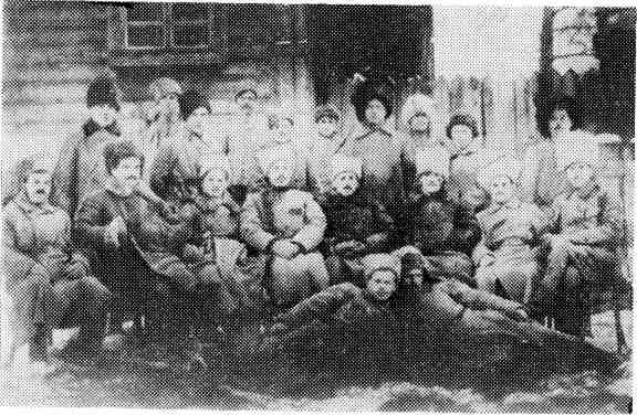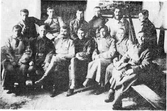 Нытвенский завод, январь 1919-го. Командиры 30-й СД. Слева направо: Киселев, Калмыков, Зубов, Павлищев, Блюхер, Цветков, Туманов. Лежат: Голубых и Смолин.