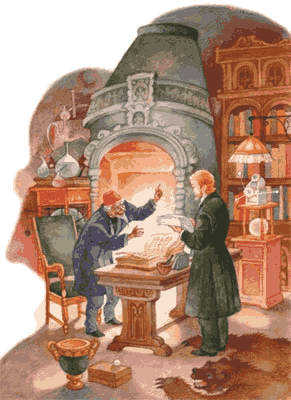 Мерцал в полутемном просторном и совсем не похожем на скворечник кабинете какой-то красный огонь. Поблескивали стальные шатуны. Тускло сияли большие прозрачные банки с выведенными из них изогнутыми стеклянными трубками. Позвякивали металлические цепочки, гирьки, колесики… Кроме того, весь кабинет был уставлен шкафами с книгами. Книги лежали на полу, на столе, на двух подоконниках. А в довершение всего молодого человека пугали чучела каких-то неизвестных ему зверей, остро и дерзко посвечивавших пуговичными глазами из темных углов…