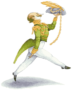 Тут же адъютант вносит на фиолетовой атласной подушечке это самое Перо: огромное, блестящее, с морской кортик величиной! А к перу ещё цепь: жёлтая, тяжеленная. Все это переливается, горит. Даже сам Император залюбовался. Налюбовавшись же вдосталь, говорит: