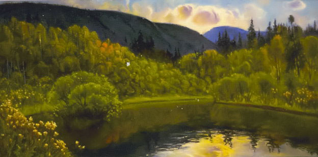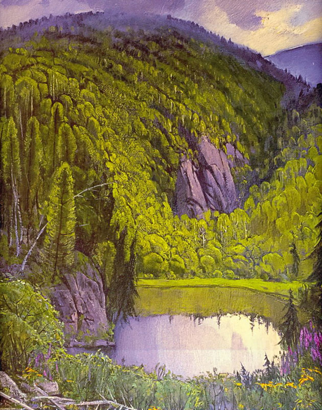 На сухой ёлке метрах в десяти от меня уселась кедровка и давай извещать своим стрекотом обитателей тайги о моем присутствии, никуда от нее не спрячешься. Постепенно солнце выходит из-за восточной горы и вот уже часть воды Абакана освещена. И сразу из темно-зеленой вода превратилась в бледно-зеленоватую с белыми пятнами просвечивающих со дна камней. Верхушки деревьев возле Агашиного озера осветились солнцем и заиграли яркими красками: сосна — светло-зеленым, береза — желтым, рябины и почти облетевшие осины — красным, кедр выделяется темной зеленью. А озеро еще все в тени, темно-темно зеленое. Тишь и покой кругом! Изредка запоют, засвистят рябчики и еще какие-то пичужки. Только беспрерывным перекатывающимся фоном издалека шумит река. Вдруг недалеко на ёлке, не замечая меня, уселись две кедровки и нежно воркуют между собой. Оказывается, что они могут не только противно крякать, но и нежно наговаривать ласковые слова друг другу.