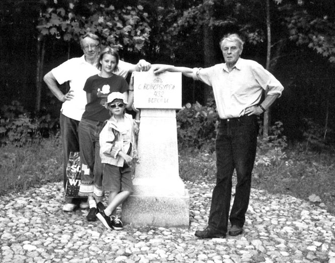 В Михайловском у памятника зайцу. А. П. Чудаков с внучкой Женей, С. Г. Бочаров с дочкой Аней