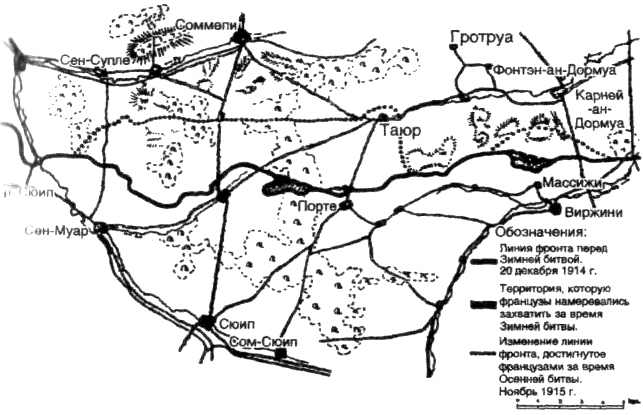Французы тогда мало чего добились, и в настоящее время они предпочитают обвинять в этом погоду. Здесь мы должны уточнить, что в те суровые зимние дни погода на обеих сторонах линии фронта была одинаково скверной. Возможно, более относится к делу то, что, несмотря на свое неизменное и значительное превосходство в пехоте, французы не сумели причинить достаточный ущерб германским укреплениям, подавить огонь германских пулеметов или парализовать германскую артиллерию.