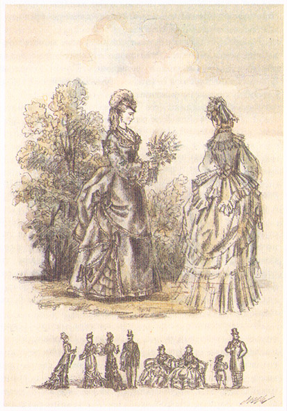 В 1870 году в моду ворвался турнюр. Женский силуэт из пышного в боках вытянулся назад — в отлёт. «Специальное приспособление в виде ватной подушечки под платье для формирования особого силуэта». Достоевский рвал и метал по поводу турнюров, сравнивал женское седалище с крупом лошади, изливался желчью на некоторых особ мужского пола, которые готовы молиться на неестественно преувеличенные размеры и непристойный изгиб нижней части женского стана. Более ироничный и мягкий Чехов писал, что мужья и любовники сажают в эти подушечки цепных собак для безопасности. Чем ответил Лев Николаевич на эту дамскую причуду... и пересказывать неловко.