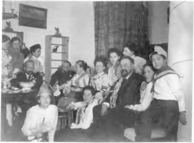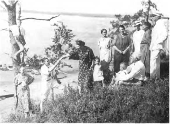 Стоят: Мария Николаевна Чибисова, Сергей, Ольга, Эка, Мери, Наталья Львовы, Софья Дмитриевна Ратиева, Зинаида Петровна Львова, Иван Дмитриевич Ратиев. Сидят: Сергей Федорович Майков с Сережей Львовым. На дереве: Саша Истомин