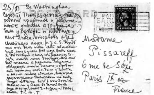 Открытка кн. Г. Е. Львова из Вашингтона в Париж Е. П. Писаревой (от 25.XI.1921).