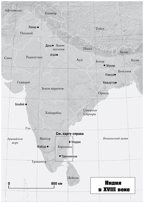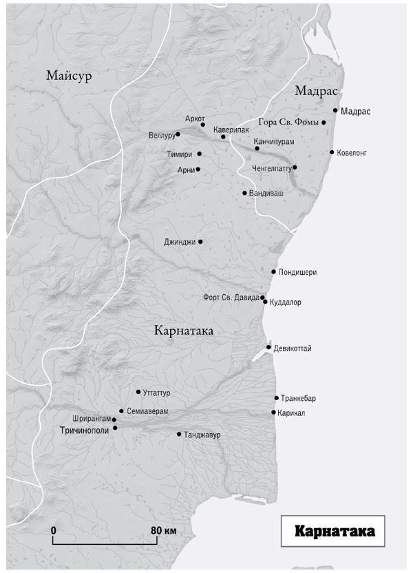 Мадрас находился на юго-восточном побережье в провинции Карнатаке. Здесь располагались все важнейшие европейские торговые центры Индии, и Мадрас считался центральным среди обширных британских анклавов, в числе которых были Калькутта и Бомбей. В центре Мадраса стоял форт святого Георгия с домом губернатора, бараками для солдат, складами и жилыми домами компании. В этой части могли жить только европейцы, правда, некоторые обеспеченные западные купцы селились и за ее пределами. Клайву компания выделила две скромные комнаты в гостевом доме на территории форта.