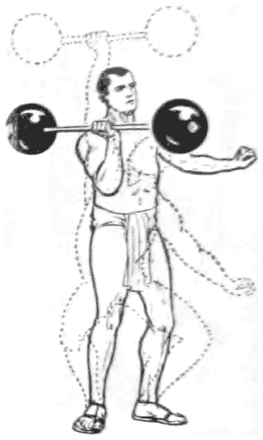 Локоть руки, держащей гантель, следует возможно крепче прижать к телу, около бедра, через что она до известной степени облегчится. Затем согнуть колени и вытолкнуть гантель быстрым выпрямлением тела и толчком руки вверх по направлению от плеча. Упражнение это следует проделывать так же часто и так же менять вес, как и в предыдущем приеме.