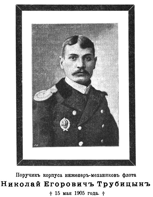 После выхода в свет 1-го издания моей книги, где был напечатан адрес Трубицына-отца, Джелепов, произведенный в штабс-капитаны, весною 1907 г. сообщил ему, что за две недели до Цусимского боя Николай Егорович, в присутствии Джелепова, сделал свой денежный взнос в 300 р. на имя своих двух маленьких братьев и сестры. Но в копию кассовой книги, сохранившуюся на госпитальном судне "Кострома", этот взнос, сделанный при свидетелях, почему-то не оказался перенесенным. Трубицын-отец сносился во этому поводу с отделом бухгалтерии Главного Управления Кораблестроения и Снабжений; через два с лишком года после Цусимского боя, казалось бы, можно было уже разобрать все такого рода дела; но там не спешат с ответами на запросы из провинции…