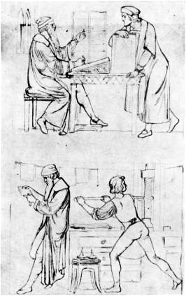 И. Гутенберг и И. Фуст. С рисунка И. Г, Мюллера по рельефу на памятнике Гутенберга в Майнце