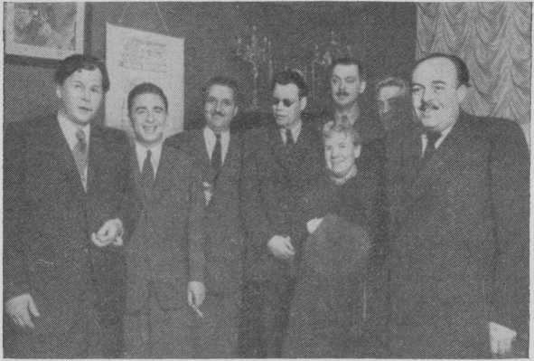 На юбилейном вечере М. Исаковского. A. Твардовский, М. Блантер, К. Симонов, М. Исаковский, B. Инбер, С. Михалков, В. Захаров, А. Безыменский