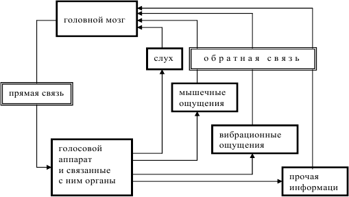 Такая схема называется системой обратной связи. В ней существуют два рода каналов и, соответственно, два вида сигналов. Одна группа нервных медиаторов (проводников) передает командные сигналы мозга исполнительным органам, то есть, мышечной системе голосового аппарата. Другая группа медиаторов возвращает мозгу информацию о работе голосового аппарата и его состоянии в данный момент.
