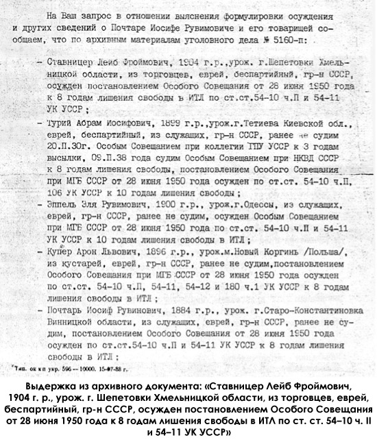 В феврале 1936 года, в Одессе, родился третий сын Ставницеров – Виктор. К радости прибавления в семье примешивалась тревога. Хотя сам Михаил Фроимович ни разу не попадал в поле подозрения НКВД, многие его друзья, сослуживцы и просто знакомые уже исчезли в подвалах Лубянки. Тревожным звонком был арест в Москве дипломата Плисецкого. Осенью 1937 года, в Бобрик-Донском, пришли и за Ставницером. Похоже, что брали его по известному принципу – был бы человек, а дело найдется. Потому что никакого конкретного обвинения Ставницеру не предъявили, вменяемая вина была более чем расплывчата – «за действия, которые могли нанести ущерб народному хозяйству». Что райотдел НКВД заинтересовался им и запрашивает информацию о его деятельности по всем прежним местам работы и проживания, Ставницер знал. Поэтому к визиту энкаведешников был готов, никаких компрометирующих материалов в доме не было. Купленный им в Норвегии бельгийский браунинг с патронами он выбросил в заброшенный шахтный ствол. В семье сохранилось предание, что отец это сделал во время прогулки с Виктором на руках.