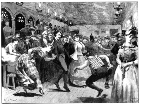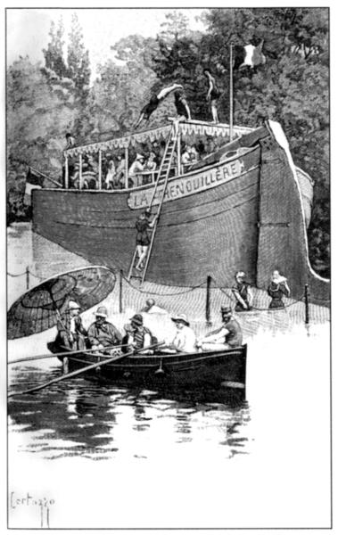 «Лягушатня» на острове Круасси. Иллюстрация Кортаццо. Фото Ж. —Л. Шарме. Внизу: Бал в «Лягушатне» вечером в четверг. 1885.