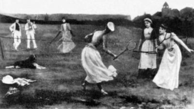 Жорж Легран, Ги де Мопассан, Эрмина Леконт де Нуи, Жизель д’Эсток, неизвестная дама и графиня Потоцкая играют в теннис. С картины Луи-Эдуарда Фурнье. Париж, Б.Н. Фото Ж.-Л. Шарме.