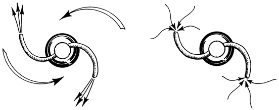 Хотя эксперимент и был весьма отрезвляющим, в течение многих лет Фейнман и Уилер с удовольствием рассказывали историю о том, что, несмотря на тщательное рассмотрение вопроса, так и не нашли ответ на него. Тем не менее эксперимент Ричард провел абсолютно верно. Его интуиция в области, связанной с физическими явлениями, никогда еще не была столь явно выражена, как и способность переходить от реальных физических свойств к формальным математическим расчетам. Поставленный им эксперимент работал. До взрыва. В какую сторону будет вращаться разбрызгиватель? Он не будет вращаться вообще. Когда вода всасывается через форсунки, они сами не двигаются вдоль этого направления, как не перемещается веревка, по которой скалолаз подтягивается вверх, раз за разом подтягиваясь на руках. У них нет выигрыша в силе перед водой. И сама идея о том, что внутри изогнутой трубки будет, как крутящий момент, действовать сила, не имеет оснований. В обычном режиме работы спринклера вода разбрызгивается направленными струями. Действие и противодействие очевидны и измеряемы. Импульс струи воды, разбрызгивающейся в одном направлении, равен импульсу вращающейся в противоположном направлении форсунки (фактически третий закон Ньютона). Но когда вода всасывается, образования водяных струй не происходит. Выделенного потока воды нет; она попадает в форсунку без четкого направления (со всех направлений), поэтому не имеет конкретной точки приложения, и говорить о силе не приходится.