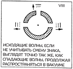 Волны, распространяющиеся вперед и назад во времени. Уилер и Фейнман предприняли попытку разработать приемлемую схему взаимодействия частиц, но столкнулись с противоречием понятий «прошлое» и «будущее». На частицу оказывается действие, влияние которого распространяется подобно волнам от брошенного в воду камня. Для симметричности теории им пришлось бы использовать внутринаправленное волновое действие, идущее вспять во времени.