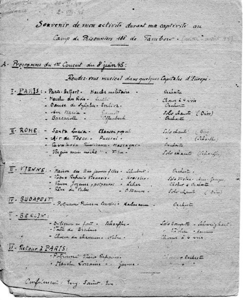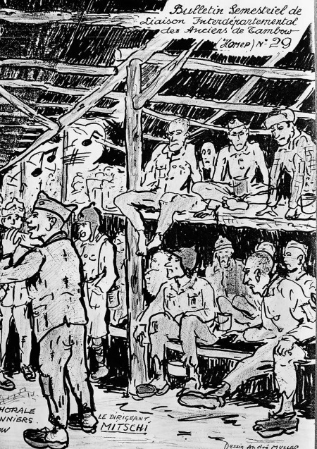 В то же время я познакомился с одним из пленников 1940-го, учителем начальных классов из Мортань-дан-ль’Орн, Пьером Дюрозуа, который приходил в библиотеку, чтобы не закоснеть на нарах, чтобы заставить работать ум и память. У него был настоящий талант писателя, и он написал маленькую сатирическую пьесу о нацизме, «Преступления и наказания», которую несколько раз играли в лагерном театре французские актёры-любители. Ещё у него была идея написать что-то вроде оперетты или, скорее, Singspiel — пьесу, в которой сцены будут перемежаться музыкальными номерами и песнями, для которых музыку должен был написать я. После войны мой друг композитор Карл Рейш настоял на том, чтобы я переложил один из этих номеров, медленный вальс, для маленького оркестра и фортепиано. Я исполнял его два или три раза в концертах хорового союза Сульцерена под названием «Воспоминание о Тамбове, или Ностальгия».