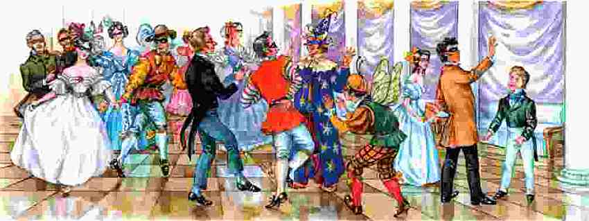 А вместительная зала полна ряженых. Они одеты в необычные костюмы, на лицах у всех черные или серебряные полумаски. Ряженые изображают столичные альманахи и журналы. В руках держат огромные картонные книги, наперебой выкрикивают строчки из стихов, статей. Но вот постепенно порядок налаживается.