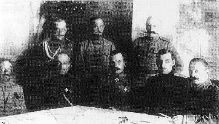 Генералитет Белой Сибири. Сидят: крайний слева — ген. В.О. Каппель, в центре — ген. М.В. Ханжин, справа от него ген. — Д.А. Лебедев